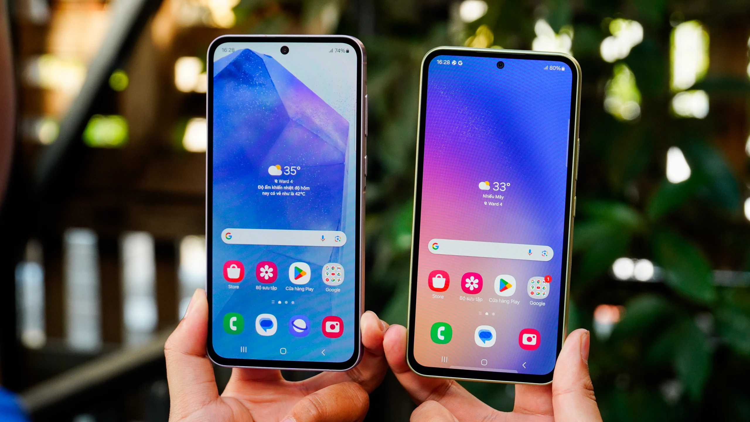 Galaxy A55 5G (trái) có màn hình lớn hơn Galaxy A54 5G (phải) dù phong cách thiết kế gần như tương tự.