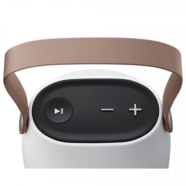 Có thiết kế dạng trụ tròn bo gọn phần đầu trông giống như một chiếc bình đựng nước độc đáo, đẹp mắt. Sự phối hợp của màu trắng mờ và xám tạo nên vẻ thanh lịch, tinh tế, phù hợp với mọi không gian. Kích thước nhỏ gọn với trọng lượng chỉ 396 g cùng việc trang bị thêm quai xách giả da làm từ nhựa cứng giúp người dùng có thể thoải mái cầm theo loa khi di chuyển hoặc treo ở nhiều vị trí khác nhau, thuận tiện khi sử dụng.